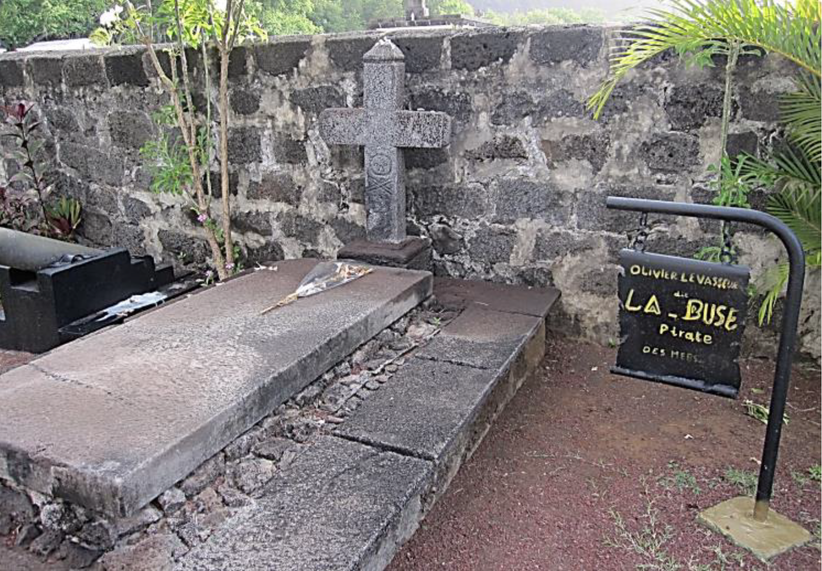 The hanging of La Buse marks the end of the so-called great age of piracy in the region, but gave birth to a legend. It was said that, mounting the scaffold, he threw into the crowd a cryptogram that indicated where he had stashed his loot. People have been searching for this supposed treasure ever since. The legend is discussed at length elsewhere on this website, and here it will suffice to say that such is the interest in the story of La Buse that visitors to Réunion, asking to see his grave, are taken to a cemetery which was not even opened until fifty years after the pirate’s death, shown a black basalt headstone inscribed with a commemorative text and accompanied by a purpose-built sign! This fake heritage was definitively debunked in 2010 when it was discovered that the tombstone purporting to be that of La Buse had simply been reversed, and that the hidden epitaph was that of a former slave woman Delphine Hélod who died in 1836. It remains nevertheless one of the curious tourist attractions on the French island of Réunion today.
